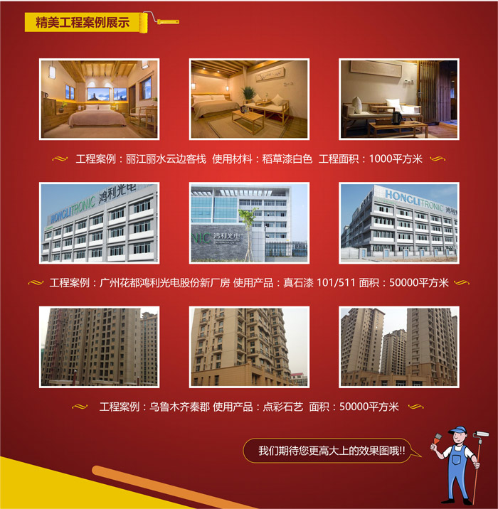 圖片要求:主體工程施工前后的全過程效果圖片(有顯示萬(wàn)磊公司LOGO的材料和包裝為佳),每個(gè)工程精選3-5張,圖片清晰,主體建筑無(wú)遮擋,效果高檔大氣。請(qǐng)將您的工程案例圖片發(fā)送至我公司推廣部郵箱: wanleituliao@foxmail.com,同時(shí)注明客戶所在區(qū)域及公司(客戶)名稱、工程項(xiàng)目名稱,使用材料及施工面積。我們將在收到圖片后對(duì)照片進(jìn)行一一篩選,并將以郵件形式回復(fù)您,在我公司網(wǎng)站上公布獲獎(jiǎng)?wù)呙麊尾㈦娫捀嬷?br />   萬(wàn)磊的發(fā)展離不開您的支持,歡迎廣大客戶踴躍參加,如有疑問可咨詢指定區(qū)域經(jīng)理。